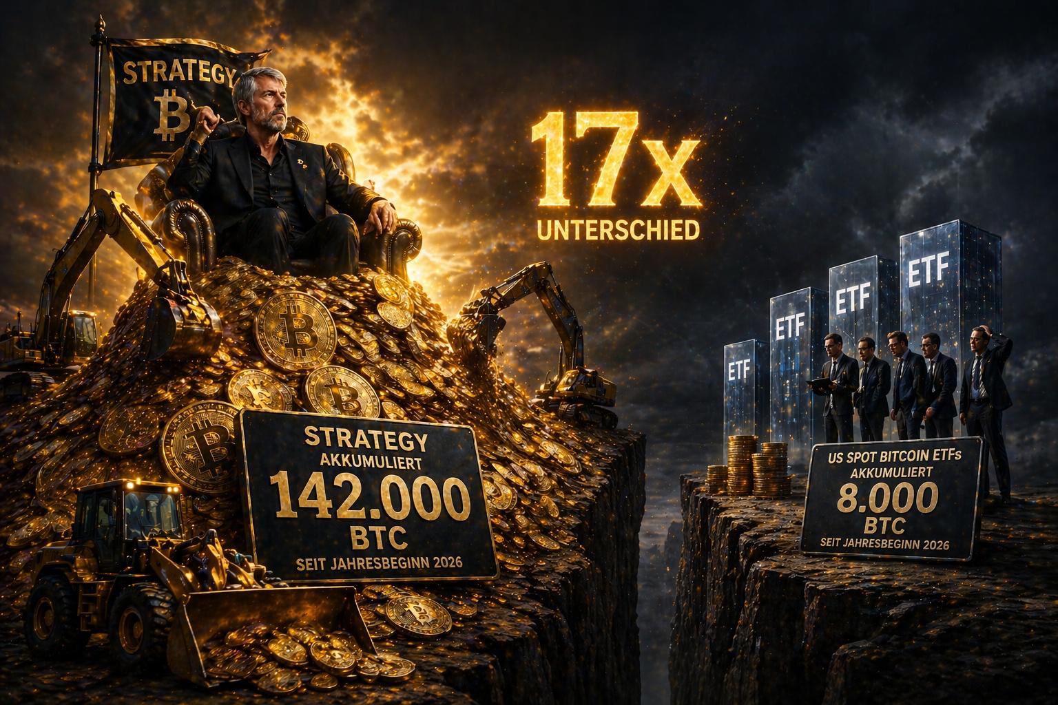 Die Bitcoin Akkumulation 2026 zeigt ein bemerkenswertes Ungleichgewicht zwischen zwei Käufertypen. Während Strategy seit Jahresbeginn 142.000 BTC akkumuliert hat, kommen sämtliche US-Spot-Bitcoin-ETFs zusammen nur auf 8.000 BTC. Das ist ein Verhältnis von fast siebzehn zu eins.