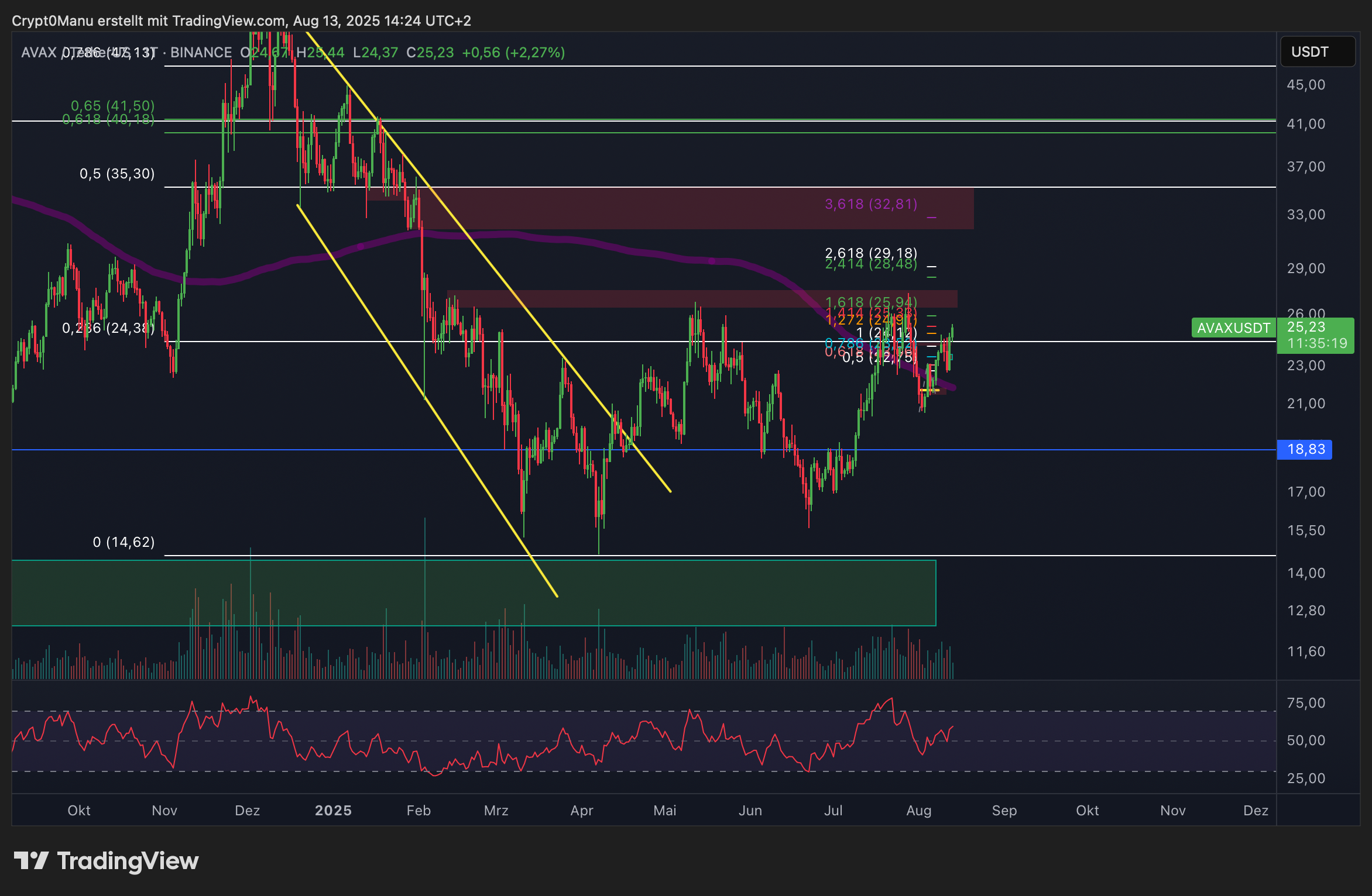 Brechen wir auch dieses, erwarte ich das Golden-Pocket 0.618 – 0.65 Fib. Level) von unserem Hoch Ende 2024. Dieses Zwischenziel bzw. Bullrun-Ziel liegt dann bei 41 – 44 USD. Weitere höhere Ziele könnten bei Bruch dieses Widerstandes entstehen.