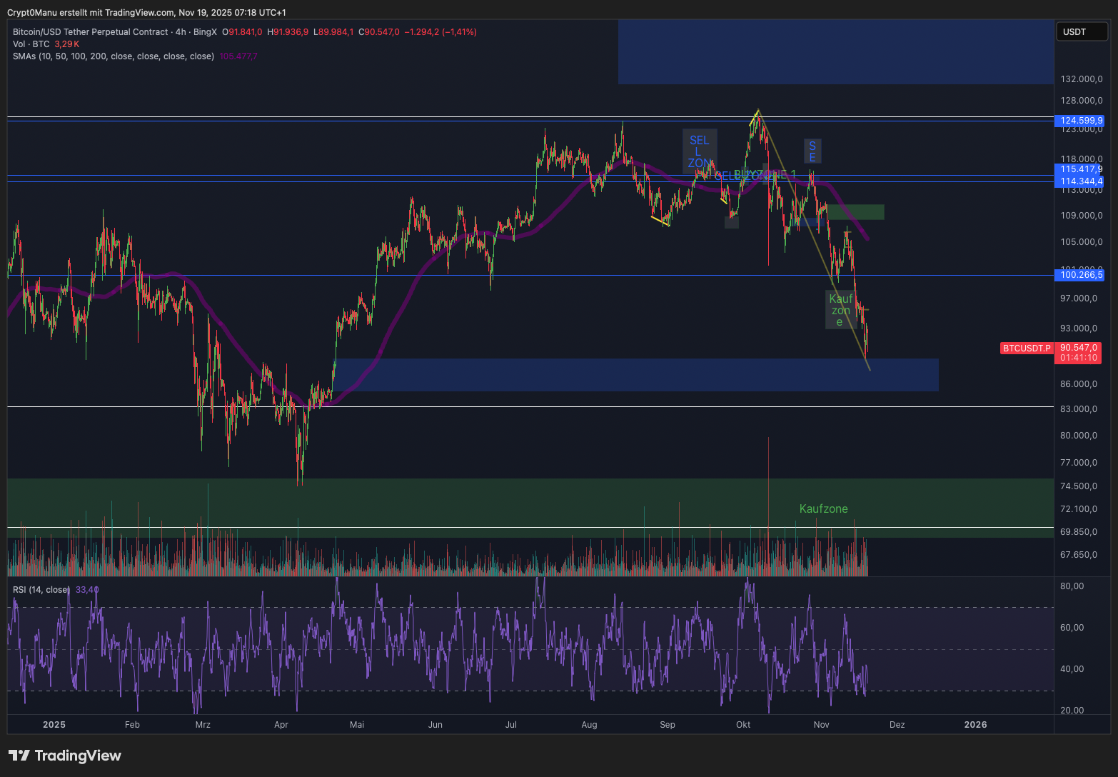 Derzeit traden wir knapp unter 91.000 USD und somit weiterhin in einer Abwärtsbewegung. Der Markt ist weiterhin unter Druck und NVIDIA kommt erst heute noch. Die Arbeitsmarktdaten aus den USA für September waren ebenfalls nicht sonderlich gut.