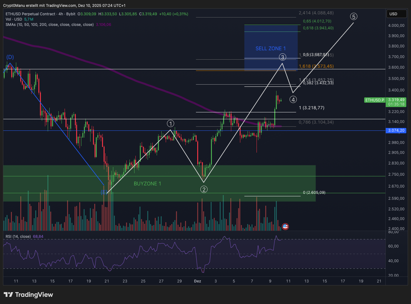 Trotzdem ist diese Bewegung gut. Auch hier müssen wir damit rechnen, dass wir noch einmal eine kleine Korrektur in den nächsten Stunden bis auf ca. 3.200 USD bekommen, bevor wir uns dann wieder auf zu neuen Höhen machen.