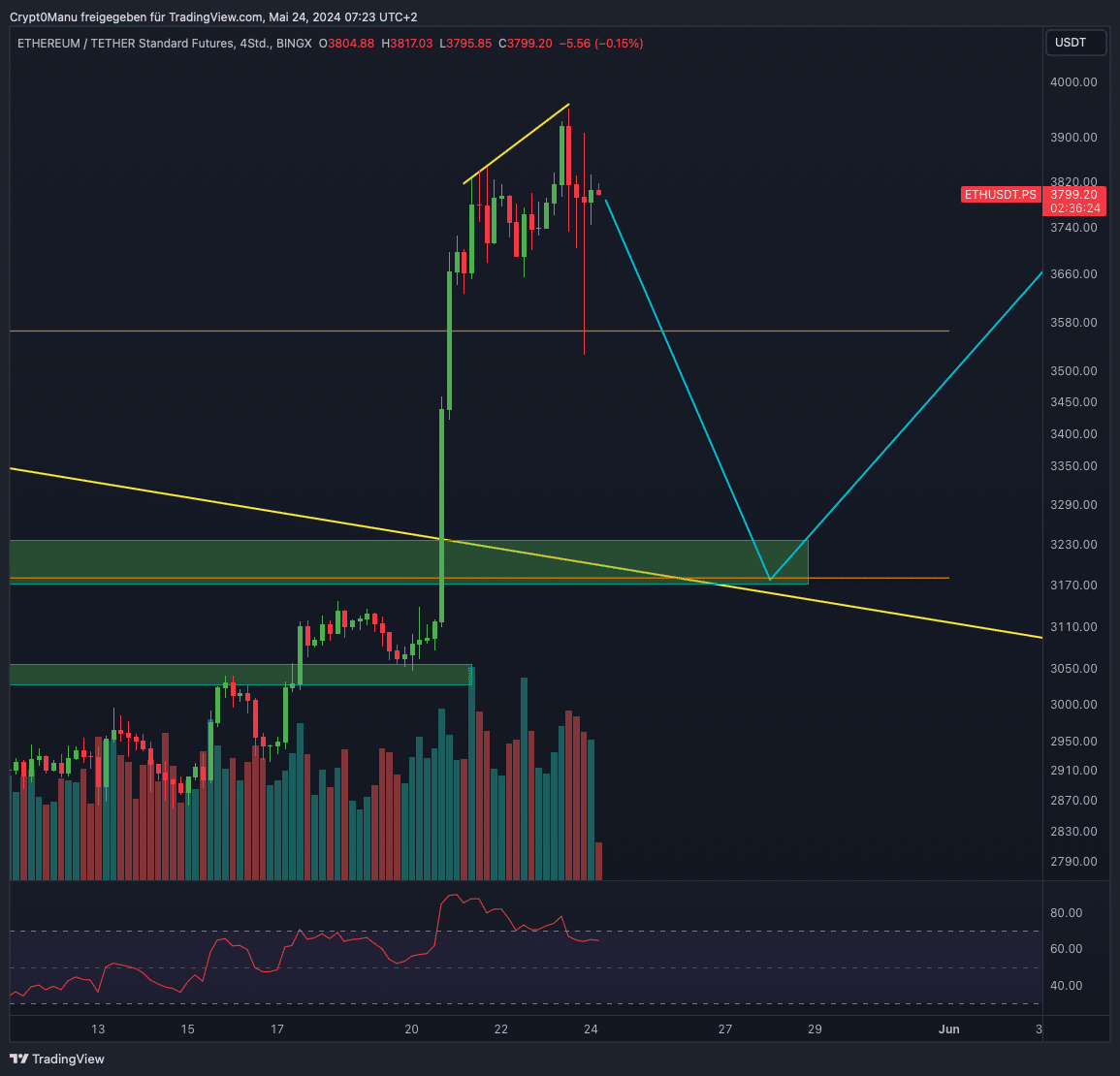 Bitcoin & Ethereum haben zu einer kleinen Korrektur angesetzt. Dafür haben wir positive News zwecks dem Ethereum ETF. Dieser wurde gestern Nacht befürwortet. Dies hatte jedoch keinen großen Einfluss mehr auf den Chart. Bedeutet dies nun eine größere Korrektur?
