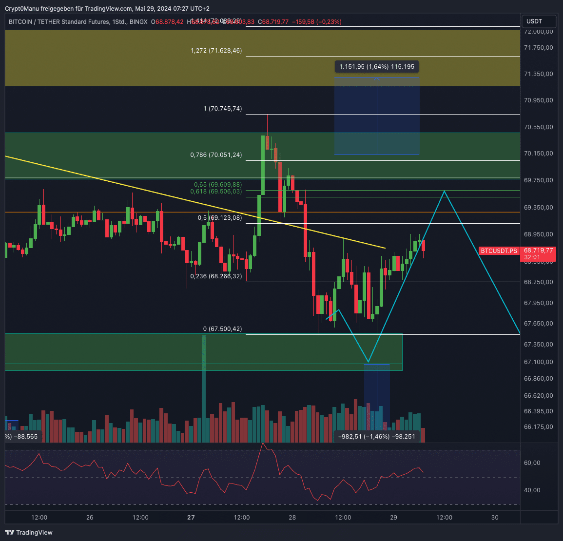 Im 4H-Chart haben wir nun erst einmal Luft bis ca. 69.600 USD. Dort wartet das Golden-Pocket (0.618 – 0.65 Fib. Level) der letzten Abwärtsbewegung als Widerstand mit einer wichtigen Zone auf uns.