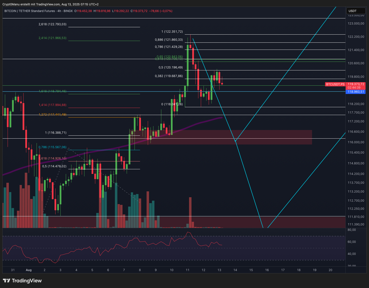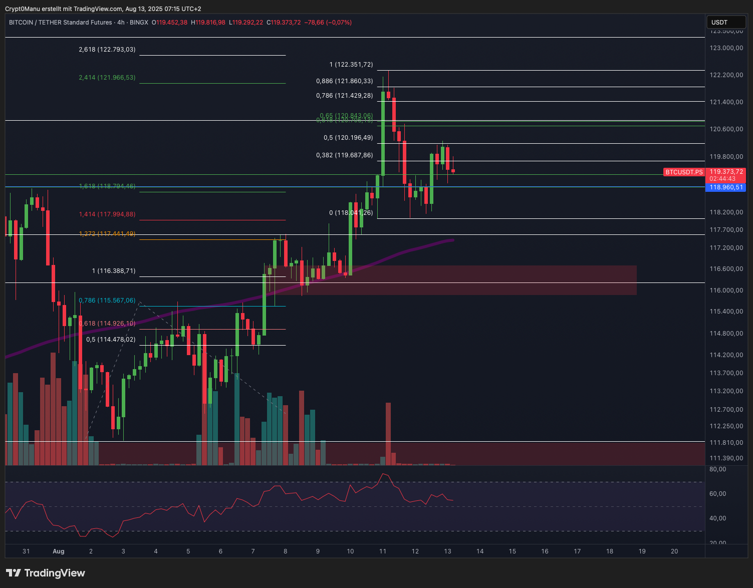 Bitcoin zeigt sich trotzdem positiv und ist leicht angestiegen und tradet derzeit wieder über der Marke von 119.400 USD. Ein starker Impuls ist jedoch bisher ausgeblieben, könnte aber bald noch folgen.