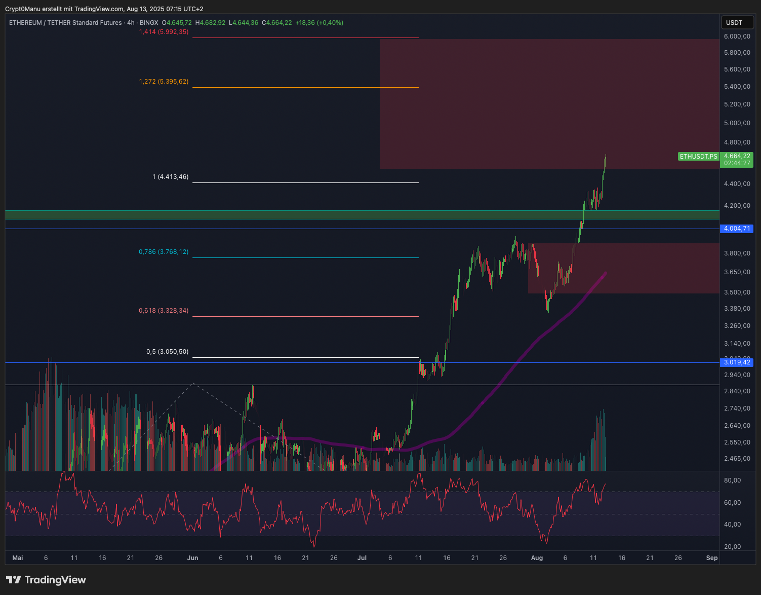 Die ETFs verzeichneten an einem einzelnen Tag Zuflüsse von über 1 Milliarde USD, was Ethereum zu immer neuen Höhen bringt. Mittlerweile traden wir bei 4.650 USD und scheinen kein Ende zu sehen.