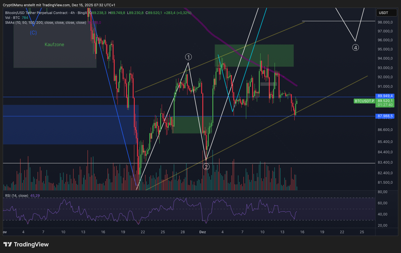 Dadurch dass wir letzte Woche an der Marke von 94.000 – 95.000 USD stark abgelehnt worden sind, haben wir es nicht geschafft ein höheres Hoch zu bilden. Somit ist der Trendkanal bzw. die Bearflag weiterhin intakt.