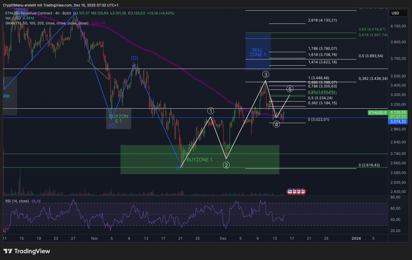Ethereum (ETH) sieht weiterhin deutlich besser aus als der Bitcoin Chart. Hier haben wir letzte Woche unser Welle 3 Ziel wirklich punktgenau abgearbeitet und nun gegen Ende der Woche die Welle 4 abgeschlossen.