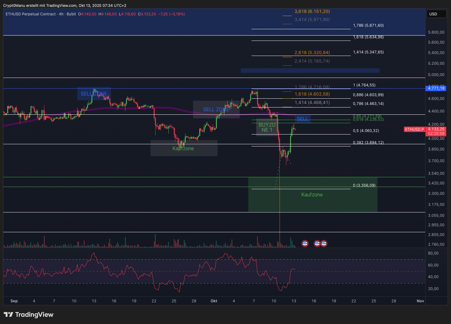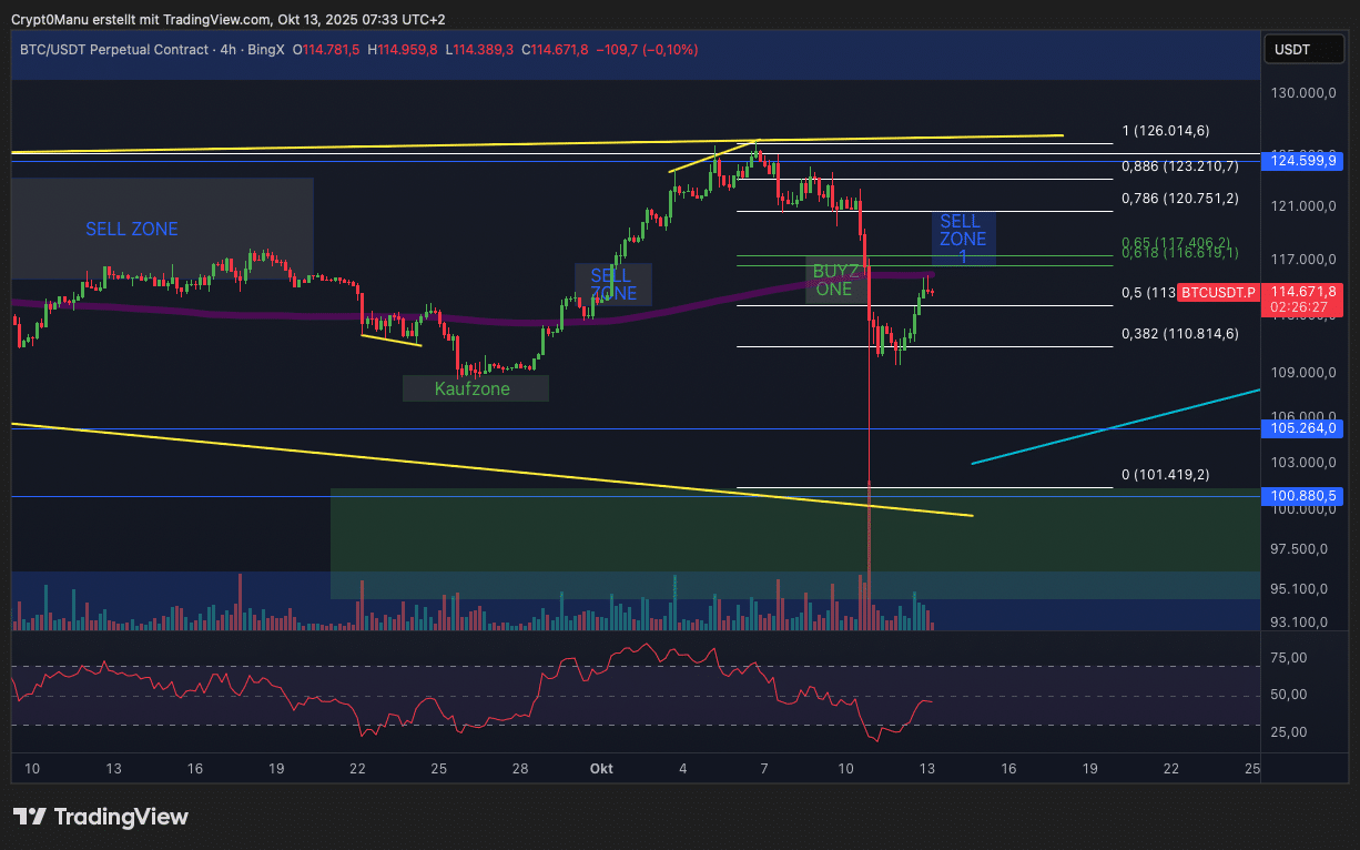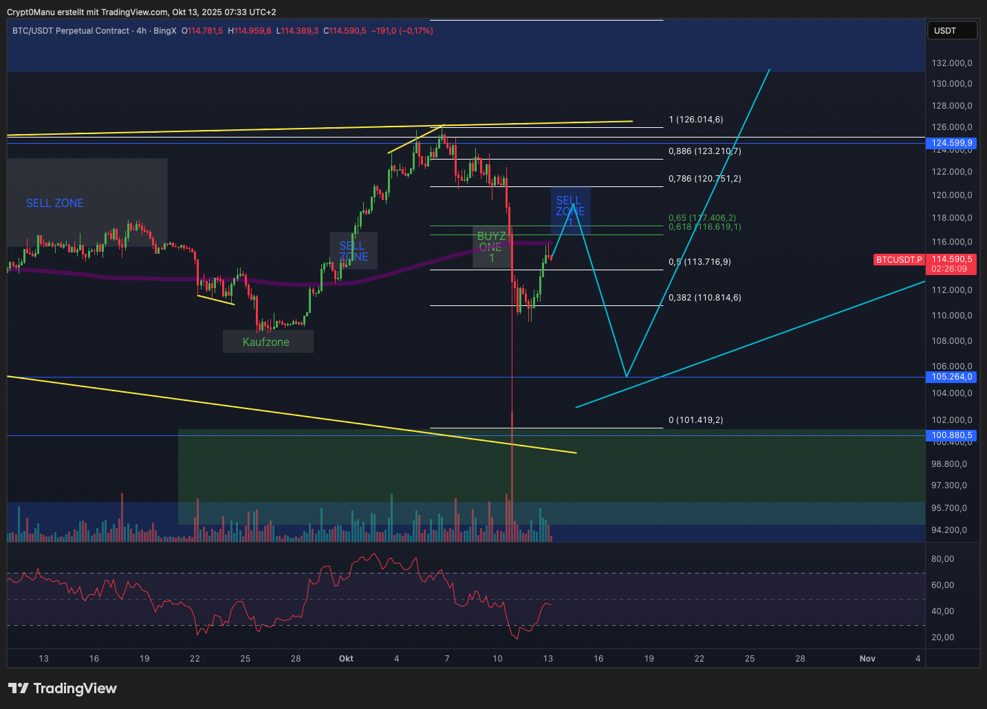 Mittlerweile könnte man meinen es ist nichts passiert. Bitcoin steht bei über 114.000 USD und wurde zuletzt am 200-SMA auf dem 4H-Chart (lila Linie) abgelehnt. Durch den Dump haben wir einen riesen Schatten hinterlassen.
