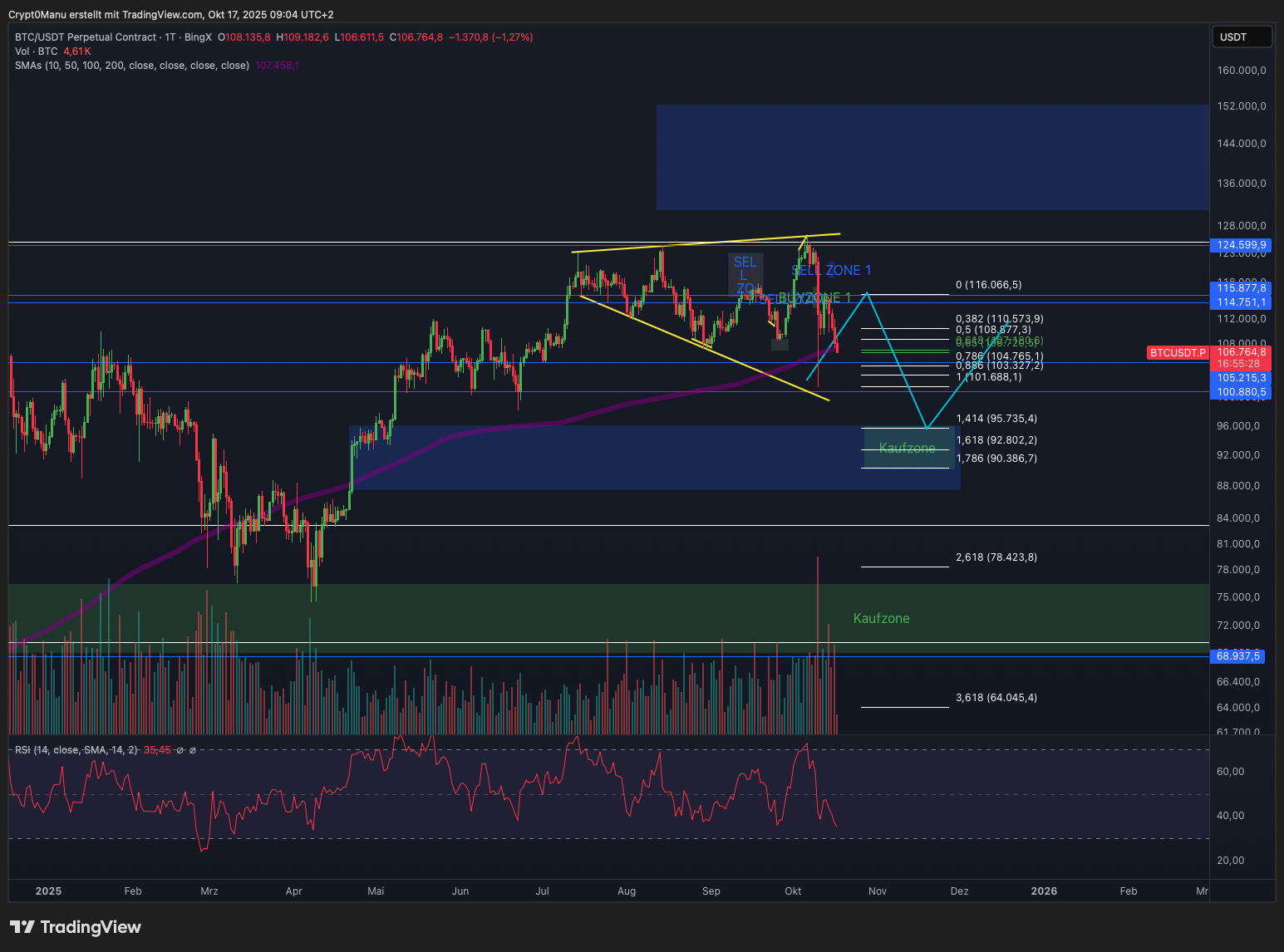 Bereits als wir nicht über das 0.5er Fib. Level gekommen sind, haben wir bereits eine bearishe Alternative bekommen und somit auch die Schwäche im Chart noch einmal verdeutlicht. Nun stehen wir unter 107.000 USD.
