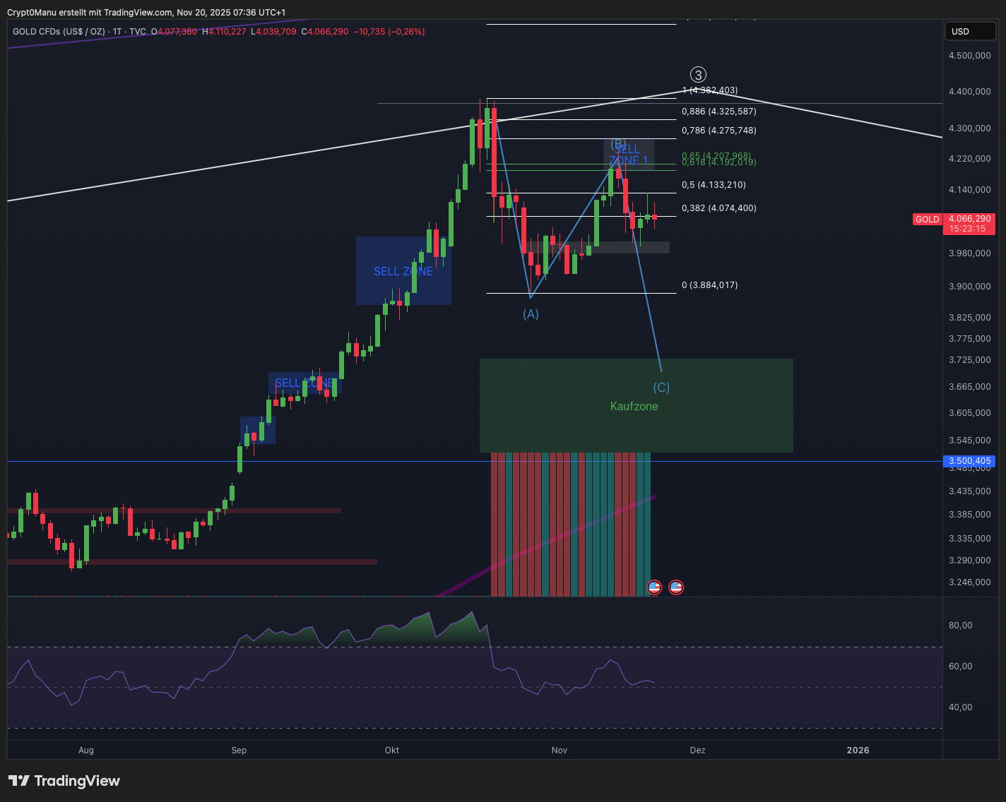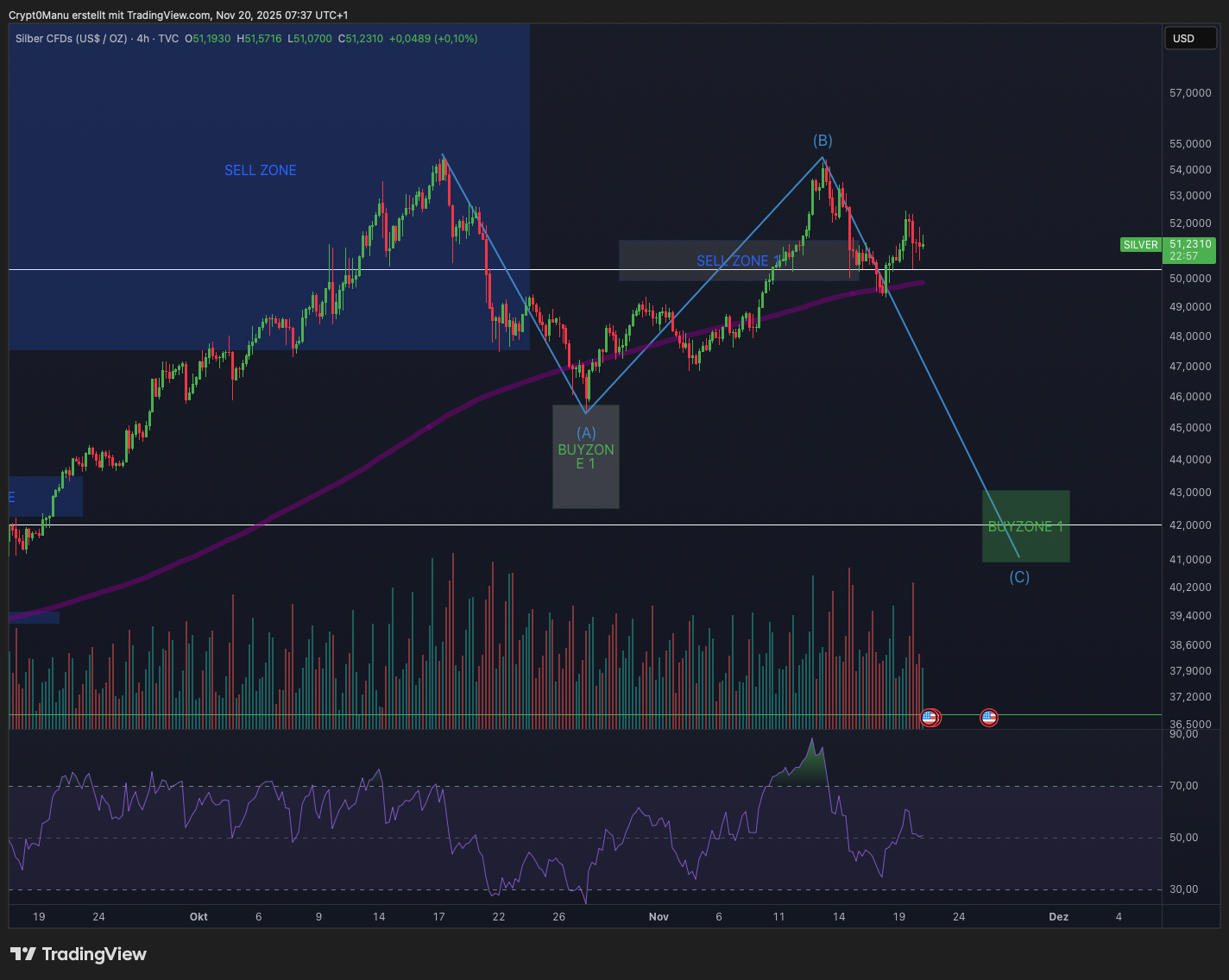Hierfür spricht, dass wir wahrscheinlich mit keiner weiteren Zinssenkung der FED im Dezember rechnen können. Dies ist meistens ein guter Katalysator für Gold, wenn dieser jedoch jetzt weg fällt, müssen wir uns auf schwierige Wochen einstellen. Sollten wir die Zielzone erreichen, haben wir die A,B,C Korrektur mustergültig abgeschlossen und könnten uns hier neu positionieren.