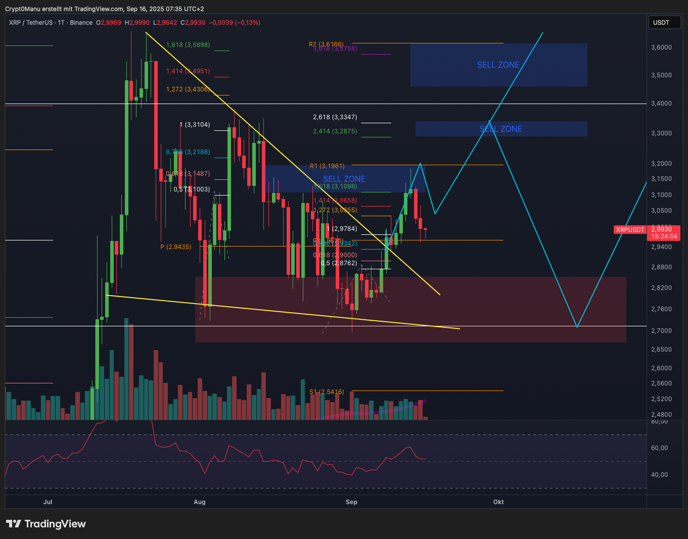 Ripple (XRP) ist von seinem Hoch bei knapp 3,20 USD gestern auf unter 3 USD abgestürzt. Derzeit kämpfen wir weiterhin mit dieser wichtigen Marke, welche gleichzeitig massiven Support bietet.