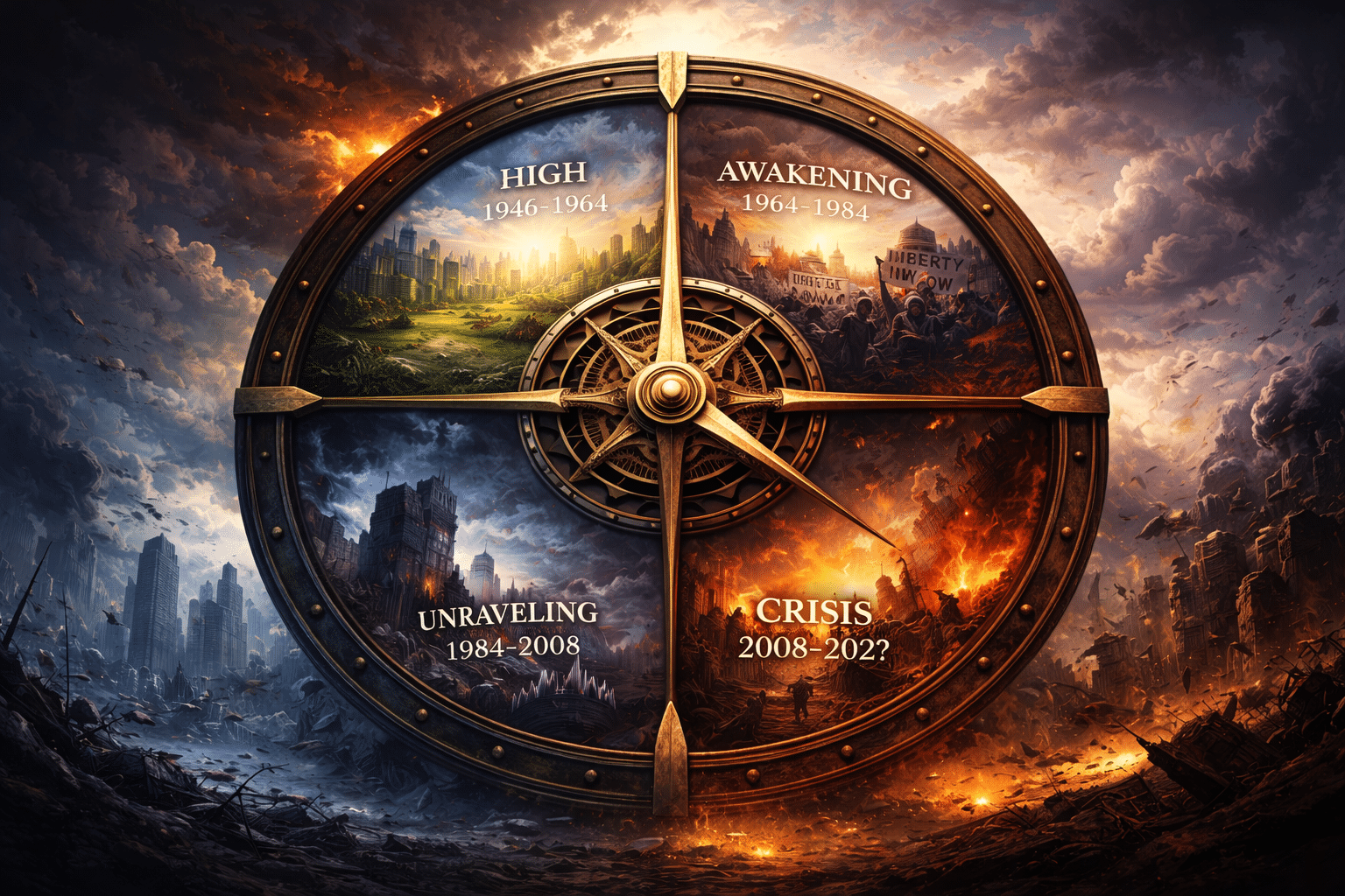 Die Theorie des „Fourth Turning“ geht auf das Werk The Fourth Turning von William Strauss und Neil Howe zurück. Sie beschreibt Geschichte nicht als linearen Fortschritt, sondern als wiederkehrenden Zyklus aus vier gesellschaftlichen Phasen, der sich etwa alle 80 bis 100 Jahre vollzieht – also über eine menschliche Lebensspanne hinweg. Jede Phase ist geprägt von typischen Wertvorstellungen, Machtstrukturen und gesellschaftlichen Spannungen. Ziel dieses Modells ist nicht die exakte Vorhersage einzelner Ereignisse, sondern das Erkennen wiederkehrender Muster. Der entscheidende Punkt: Jede Generation wächst unter anderen Rahmenbedingungen auf und reagiert entsprechend – wodurch sich kollektive Dynamiken formen, die langfristig in einen tiefgreifenden Umbruch münden.