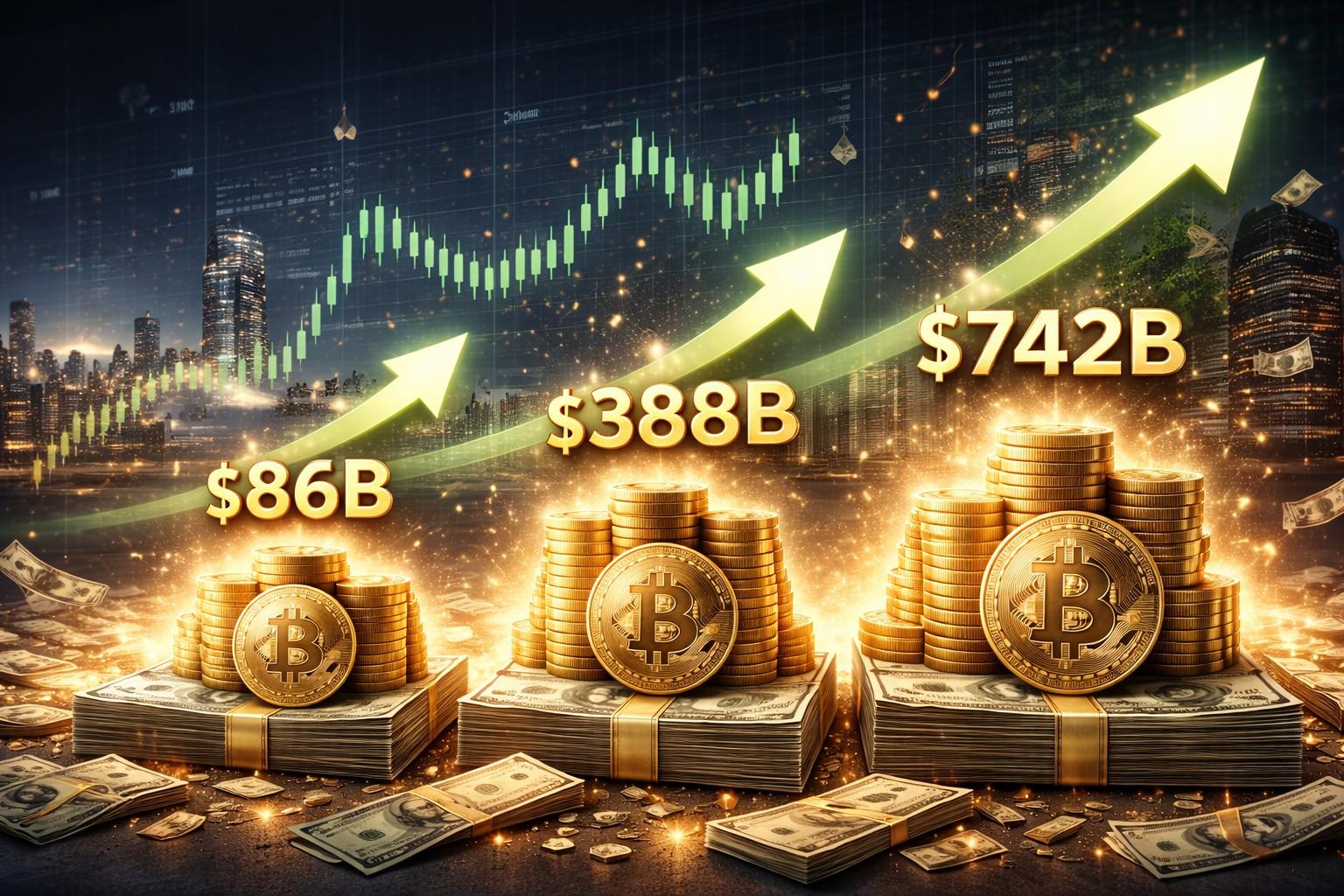 Das ist eine Verachtfachung. Die Marktkapitalisierung wuchs von etwa 320 Milliarden auf geschätzte 2 Billionen Dollar. Die absoluten Zuflüsse steigen exponentiell: 86 Milliarden, dann 388 Milliarden, dann 742 Milliarden.