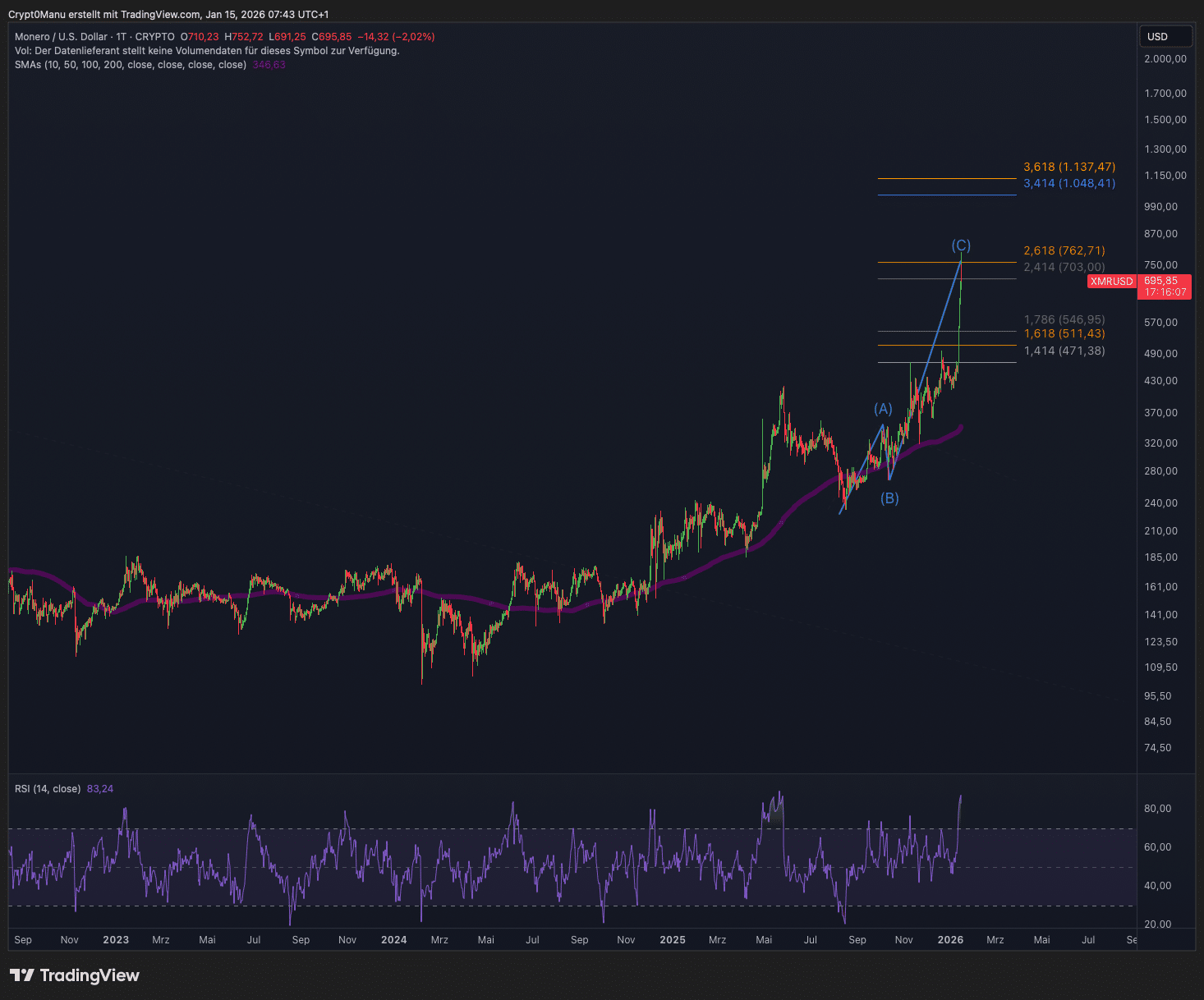 Nun, nach langer Konsolidierungszeit, ist die Zeit der Privacy Coins gekommen. Im Tageschart sind wir ebenfalls massiv übergekauft und nähern uns den Niveaus Anfang des Jahres 2025. Gleichzeitig bildet sich eine bearish-divergence.