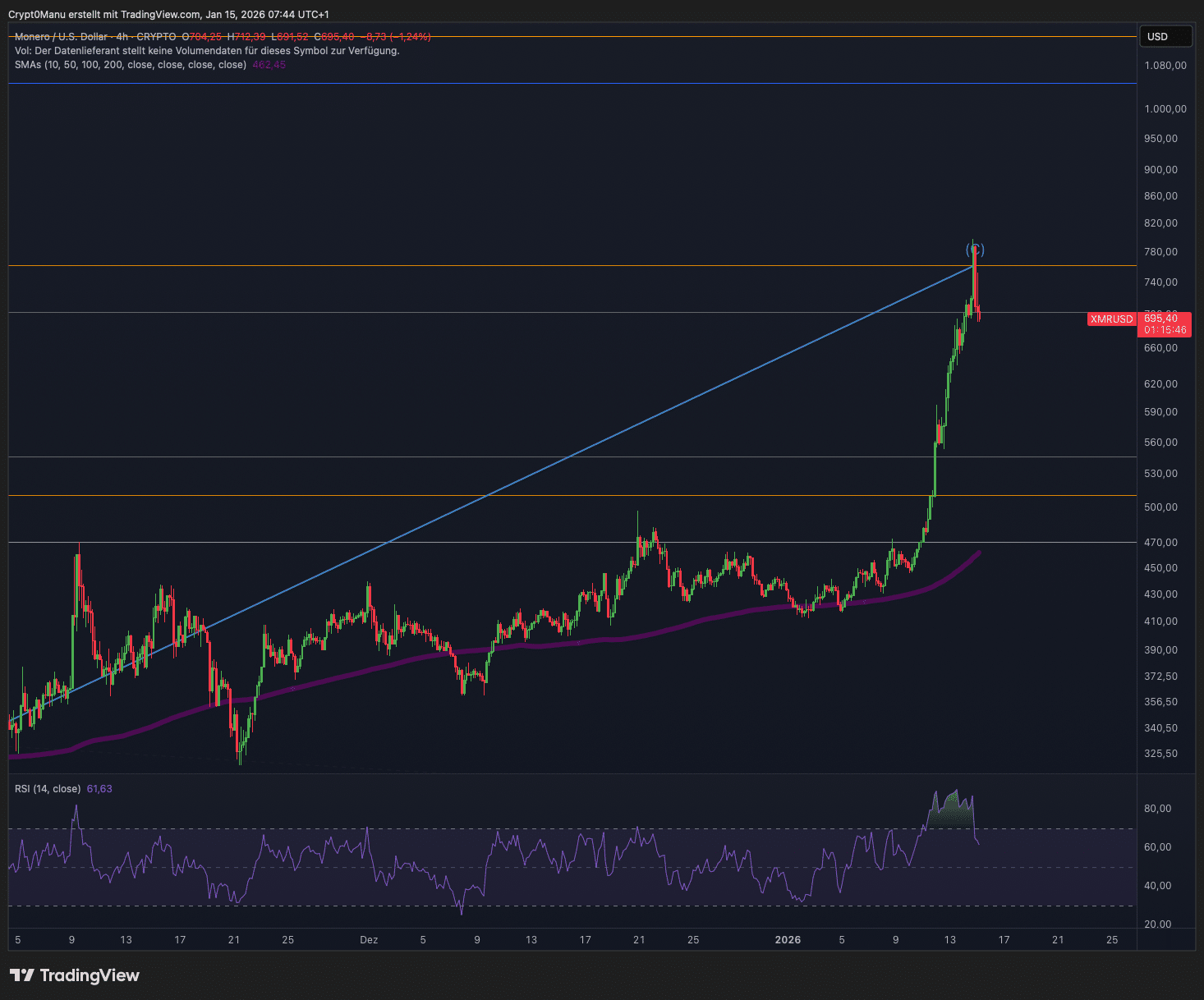 Seitdem sehen wir massive Kursbewegungen im XMR Chart. In der Spitze sind wir gestern auf über 780 USD gestiegen, konnten dieses Niveau jedoch nicht halten. Derzeit traden wir bei ca. 697 USD.